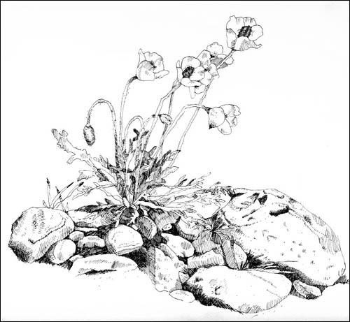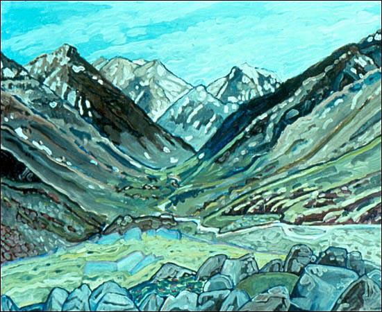 I enjoyed being a part of that life, even if only for a few weeks. I have always liked drawing and painting out-of-doors. There is something very special in the experience, and the experience in ANWR was very intense. The light is strong since the sun is up all summer. The scenery is incredible. It can rain or snow any day of the year, yet the sun is powerful. The mosquitoes are voracious. We worked all day unless the rain or snow was heavy enough to interfere with the paint on the canvas. We were surrounded by ancient caribou trails, by mountains that had raised from even more ancient seabeds and by the busy summer life of the tundra. My memories of these places will stay with me forever.