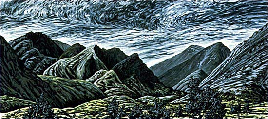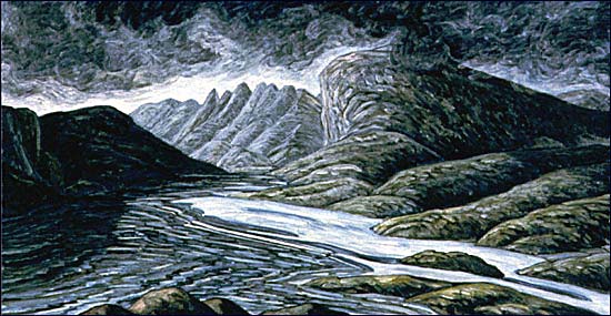 Developed On Site Study, Looking North Into the Clouds, Lower Marsh Fork, Canning River. Alkyd on canvas, 40 x 18 in, 1994-95.