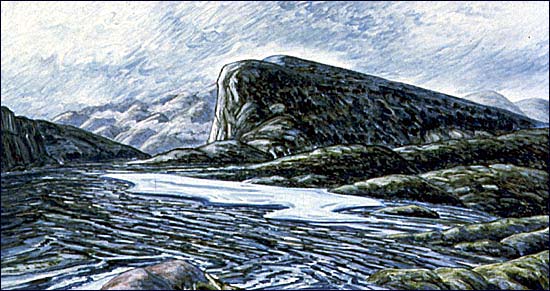 On Site Study – Wolf’s Ridge – Hula Hula River – Arctic National Wildlife Refuge. Alkyd on canvas, 40 x 18 in, 1996.