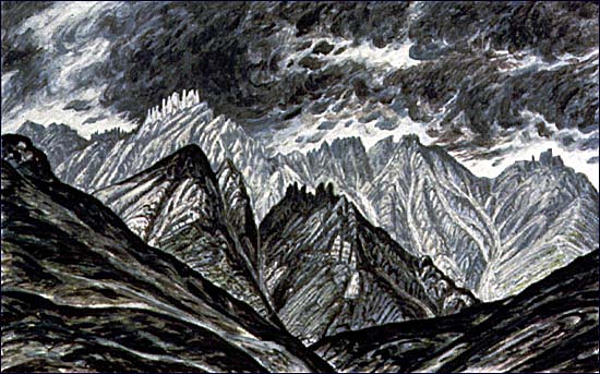 Darleen’s Mountain II, Upper Marsh Fork, Canning River. Alkyd on birch panel, 15 x 8 in, 1994.