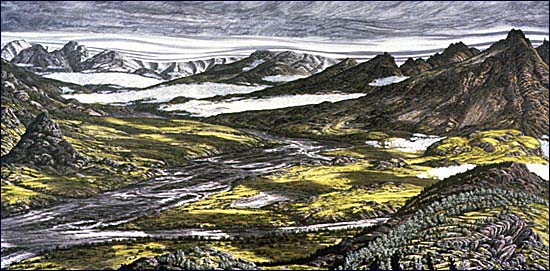 Marsh Fork, Canning River, Brooks Range. Alkyd on birch panel, 15 x 8 in, 1993-94.