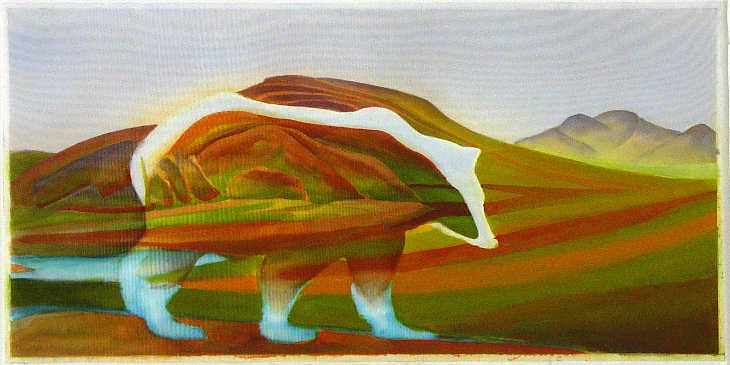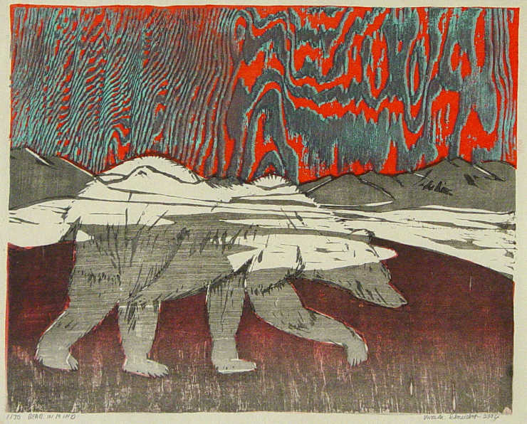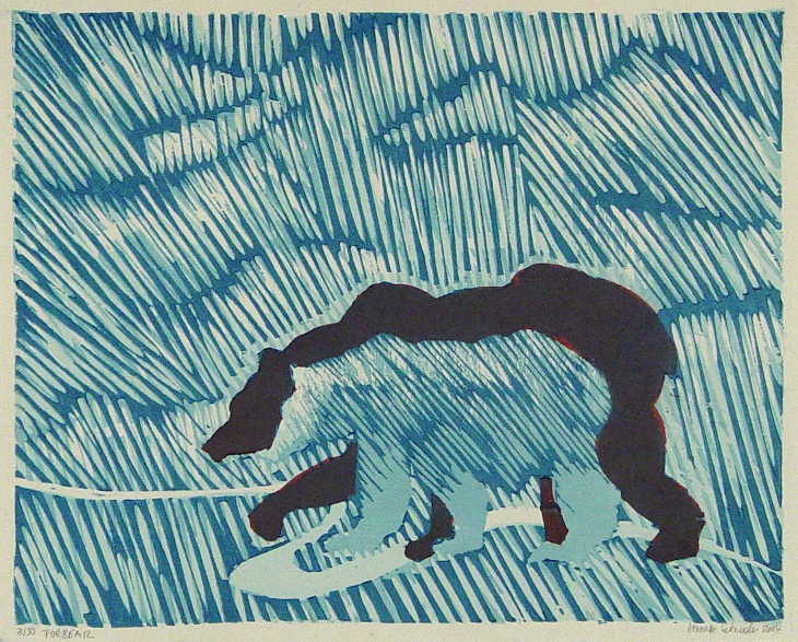 The bear woodcuts and paintings below originated from experiences I had while hiking and drawing above the Arctic Circle in Alaska. I have been there four times. The land is vast, fragile, and its life is spread far apart. The bear traverses the land alone in search of food. He walks silently, his moves are measured and swift. His coat is bleached from the sun. In the presence of a bear, you realize that he is absolute power.